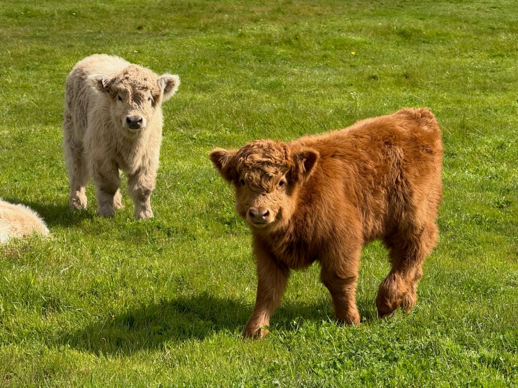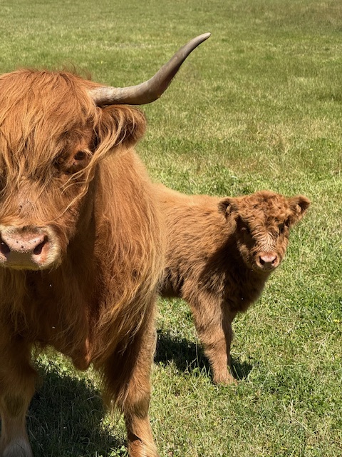 We started calving in August and we’ve had a run of girls, with 9 born for our 2025 season. We also welcomed 2 boys. We still have some red and yellow heifers for sale, (but no steers for sale this season). These calves will stay with their mothers for 8 months to learn about being a highland and to enjoy being part of our fold. Note: Although our bloodlines are excellent, our animals are unregistered, as we sell them as pets or to small breeders.
